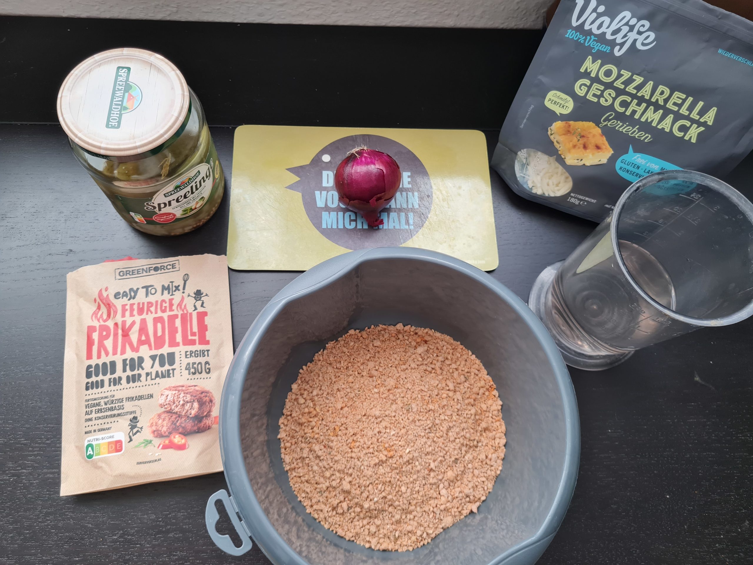Mit Zwiebel, Paprika und Gewürzgurken klein Würfeln und mit dem veganem Streukäse und/oder anderen Zutaten nach Wunsch vermengen (z.B. Pilze)