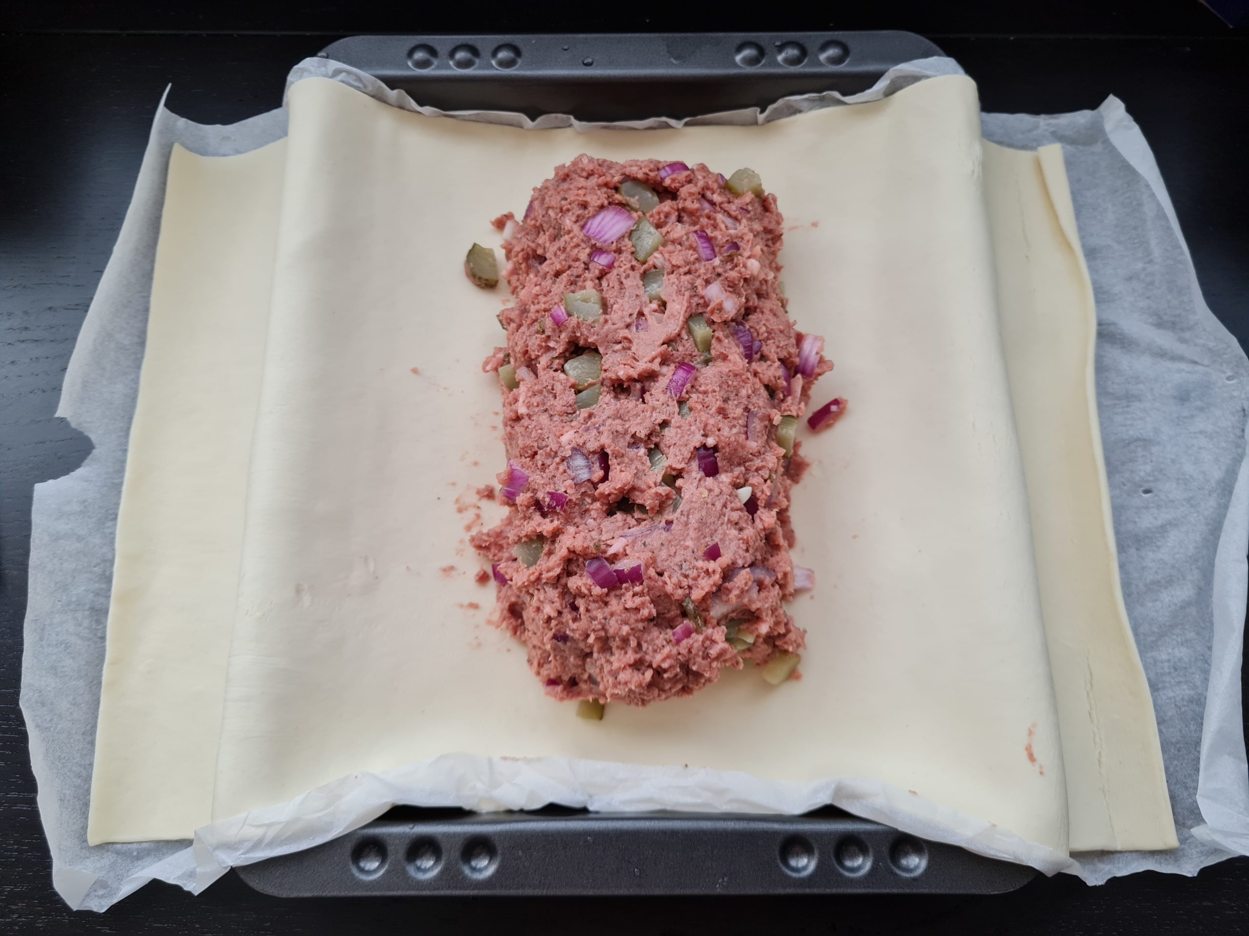 Den Blätterteig auf einem Backblech ausrollen und die Hackmasse mittig in Bratenform verteilen