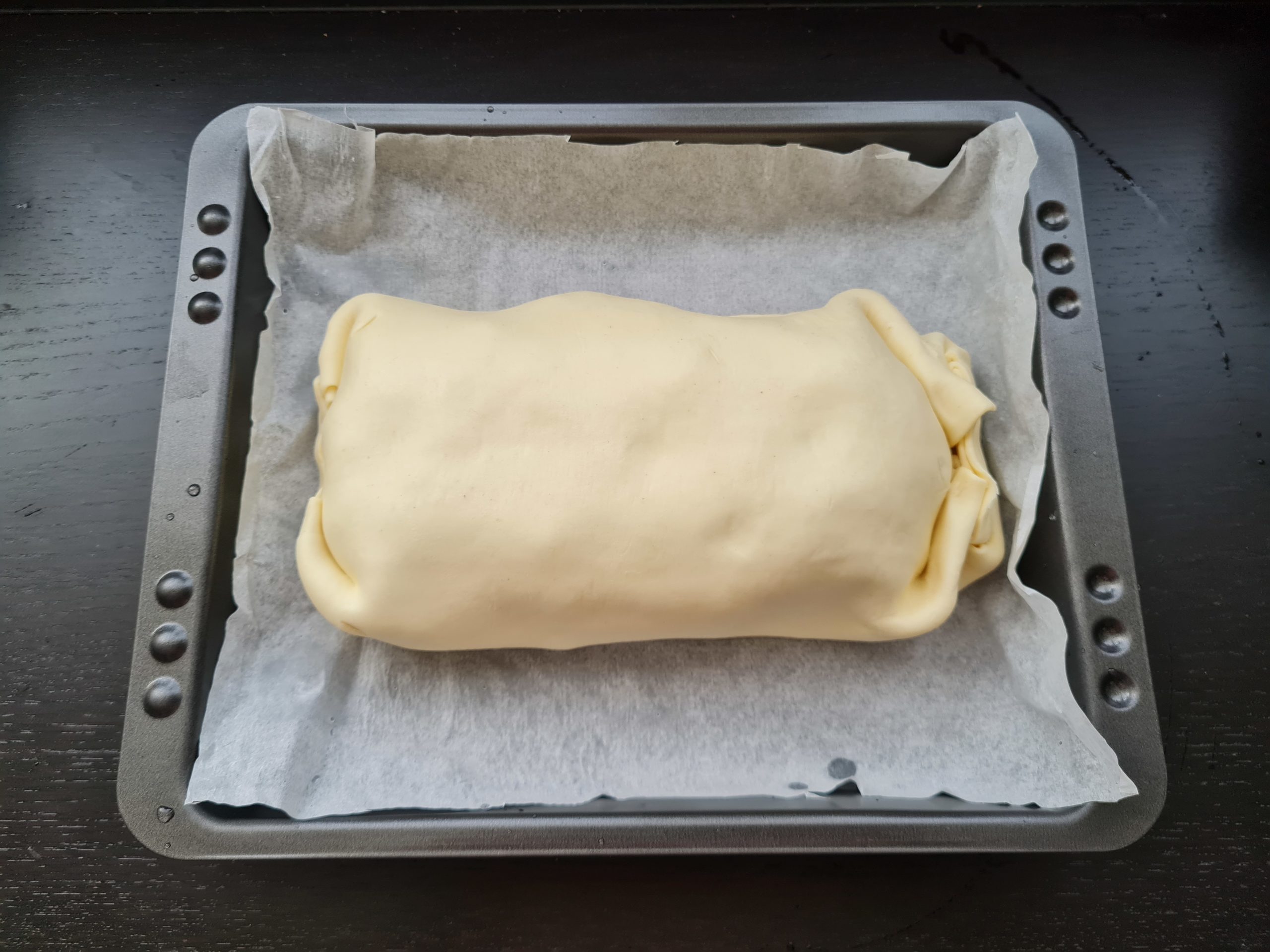 Nun den Blätterteig um die Hackmasse stülpen und den Blätterteig danach optional mit Öl oder Sojasoße bepinseln.